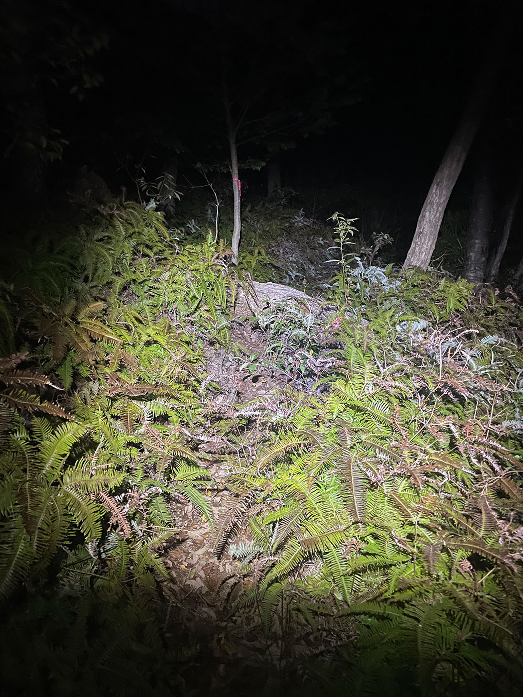 夜になり視界が狭く、トレイルも不明瞭な箇所が増え、段々と道がわかりづらくなってくる(登山口の入口も一度見逃して通り過ぎてしまった)。